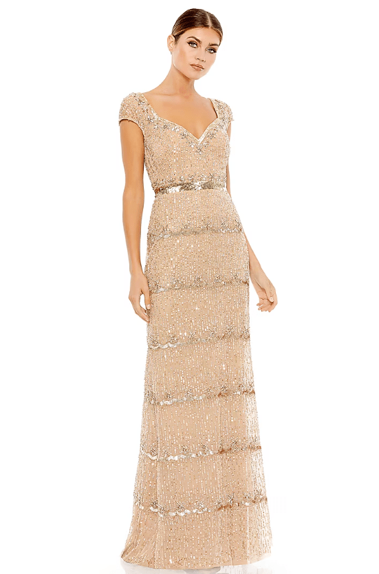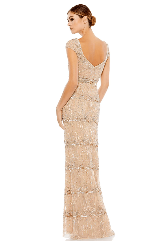 Featuring a nude gown in mesh base with embellishment. Accentuate it with statement jewellery and heels for dangler earrings and heels for a destination wedding or party.