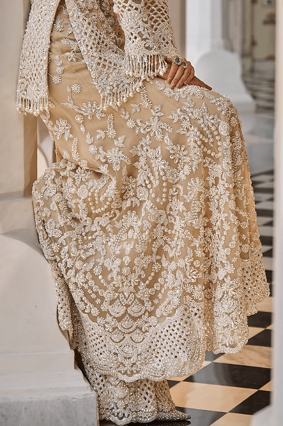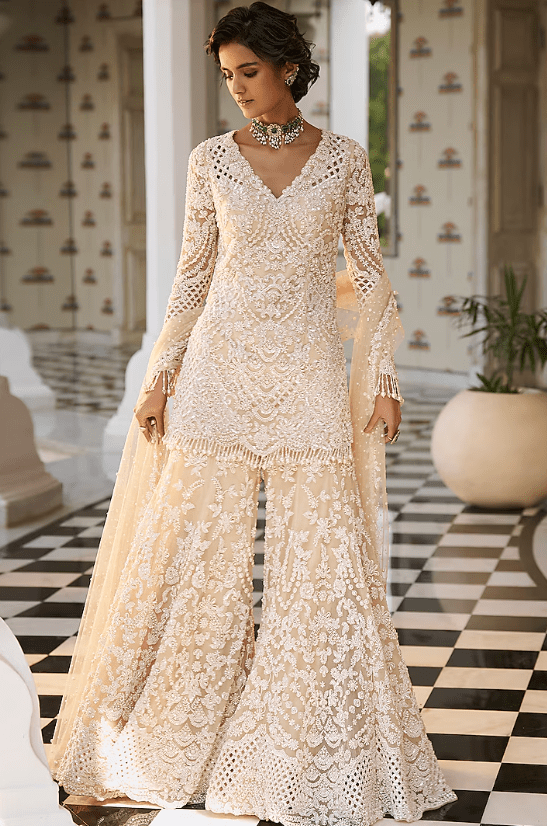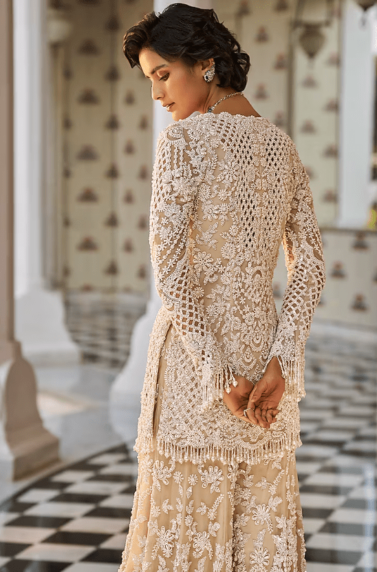 Nude Sharara Set that captivates with its elegance. The eye-catching top is crafted in net with pearl embroidery and pearl tassels detail. It is paired with embroidered sharara pants and a scalloped dupatta having pearl drops. Style it with statement jewellery and heels for a wedding, sangeet or engagement ceremony.