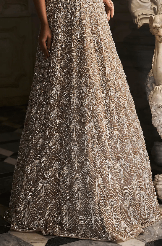 Nude Gown that captivates with its intricate embroidery. The eye-catching piece is crafted in net with pearl tassels. Accessorize the designer gown with statement jewellery and heels for a wedding, sangeet, or reception look.