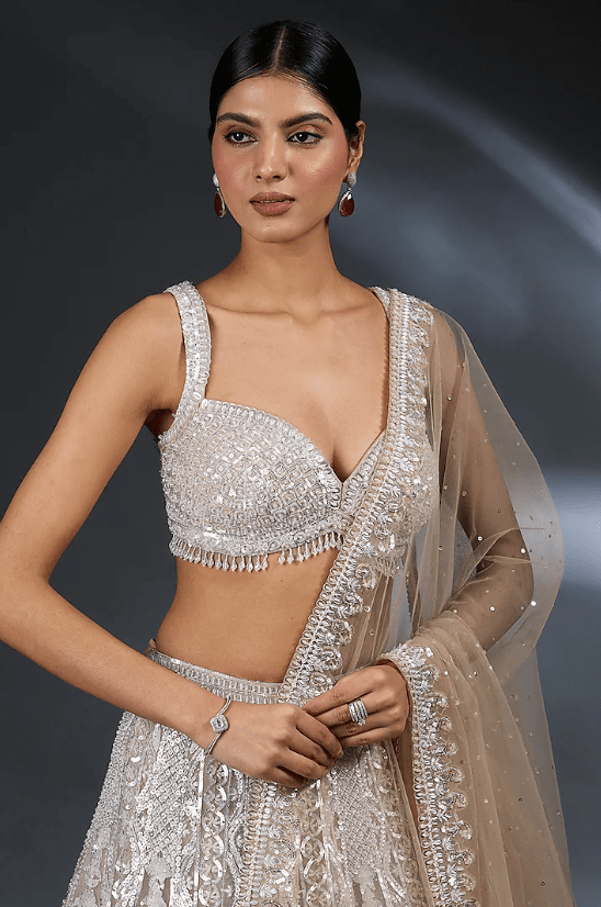Featuring a nude lehenga in net base with sequins and crystal embroidery. It is paired with a strappy embroidered blouse and a dupatta. Accentuate the designer lehenga with statement jewellery and heels for your wedding or engagement ceremony.