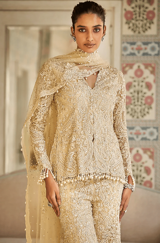 Nude Sharara Set that captivates with its elegance. The eye-catching top is crafted in net with thread, sequins and pearl paisley embroidery, including pearl tassels detail. It is paired with sharara pants and an embroidered scalloped dupatta having pearl drop detail. Style it with statement jewellery and heels for a wedding, sangeet or engagement ceremony.
