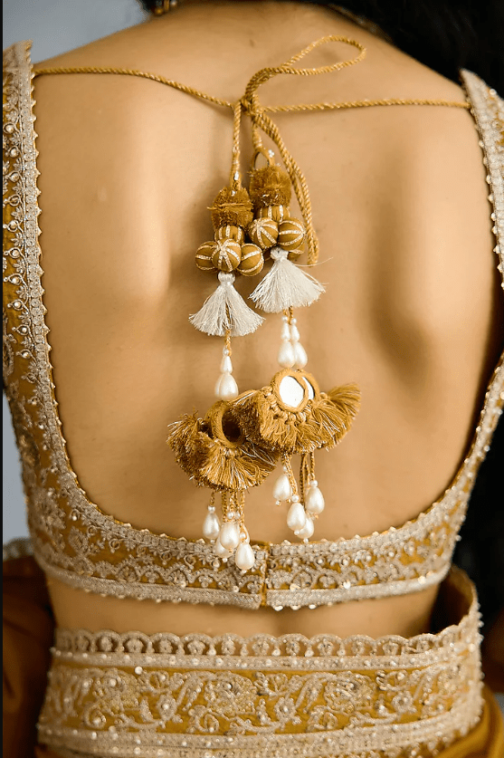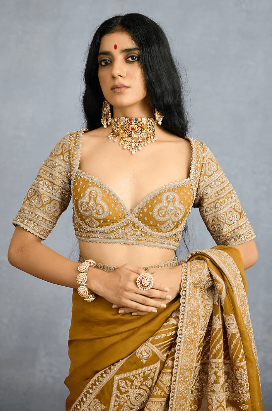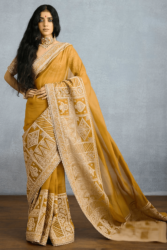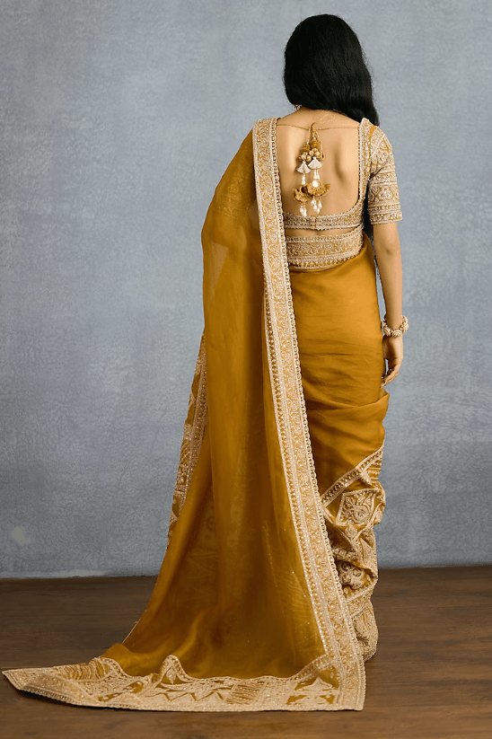 an ochre saree in jeni silk and organza base with embroidery. Style it with a sleek low bun, adorned with fresh gajra, and a embellished potli bag for an elegant festive look.