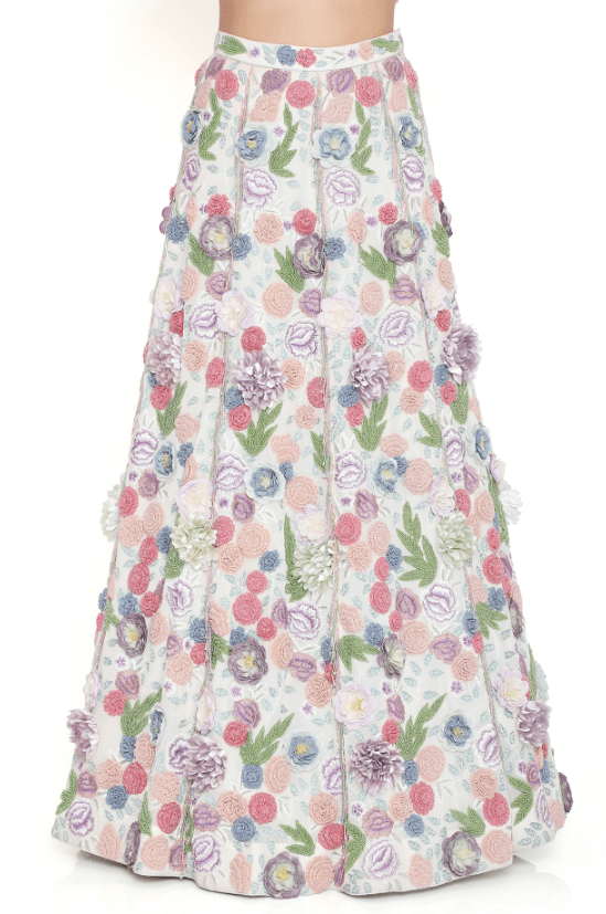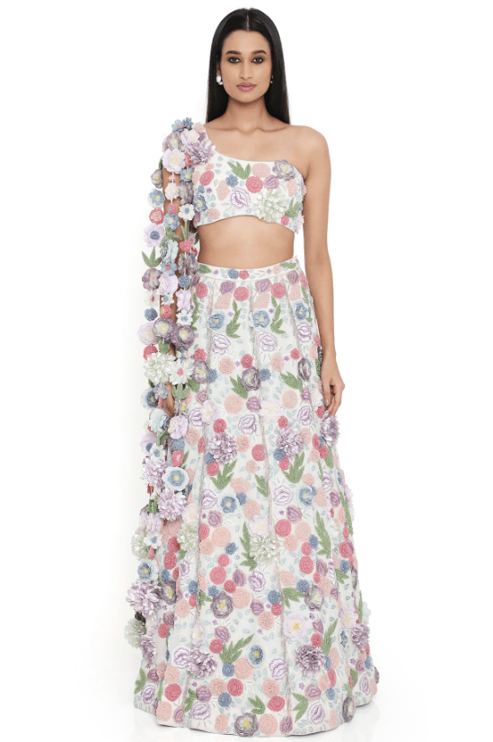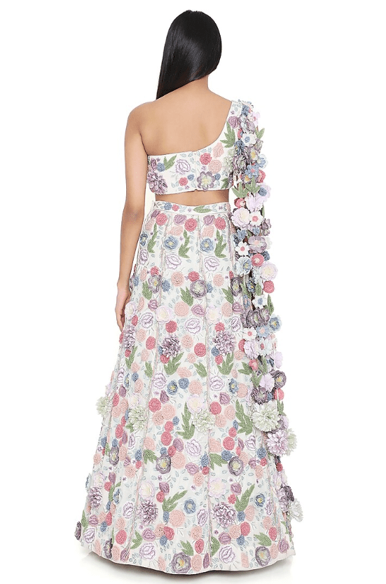 Off-White Lehenga Set that captivates with its elegance. The eye-catching lehenga is crafted in georgette with embroidery. It is paired with a choli having floral tassels on shoulder. Style the designer lehenga set with statement jewellery and heels for a wedding or engagement ceremony, showcasing style and sophistication.