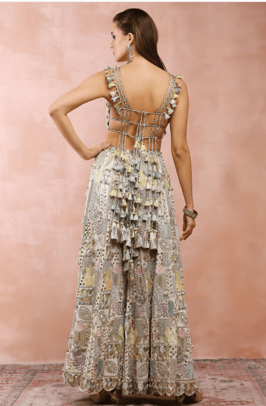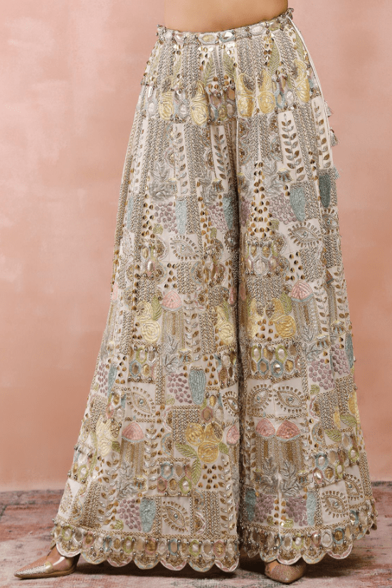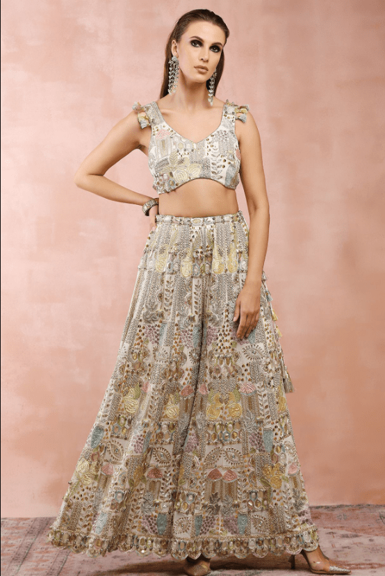 Off-White Sharara Set. Adorned with exquisite applique embroidery, the designer sharara set will be a perfect fit for festive occasions. The off-white choli is crafted in georgette. It comes with matching sharara pants and an organza dupatta.