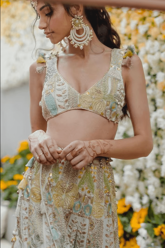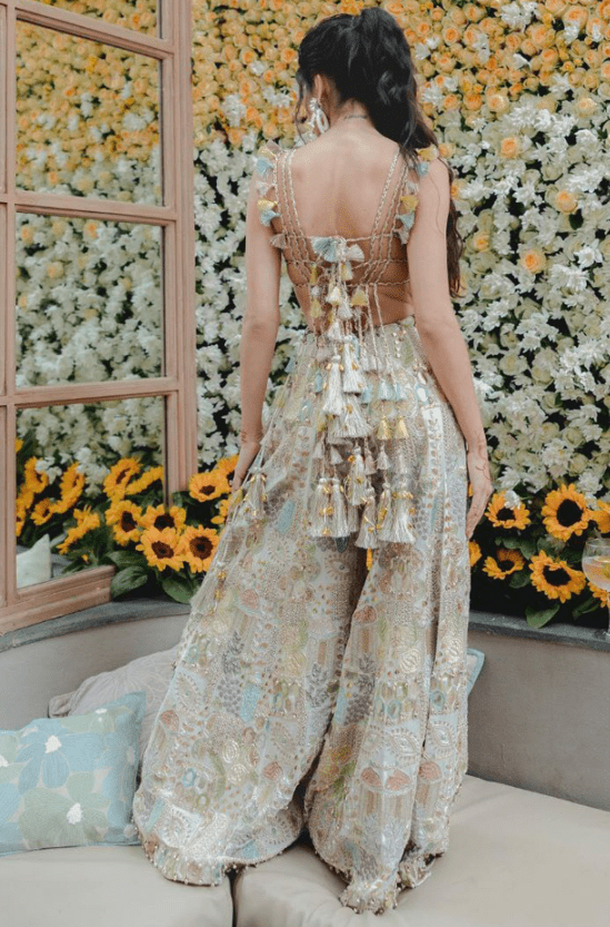 Off-White Sharara Set. Adorned with exquisite applique embroidery, the designer sharara set will be a perfect fit for festive occasions. The off-white choli is crafted in georgette. It comes with matching sharara pants.