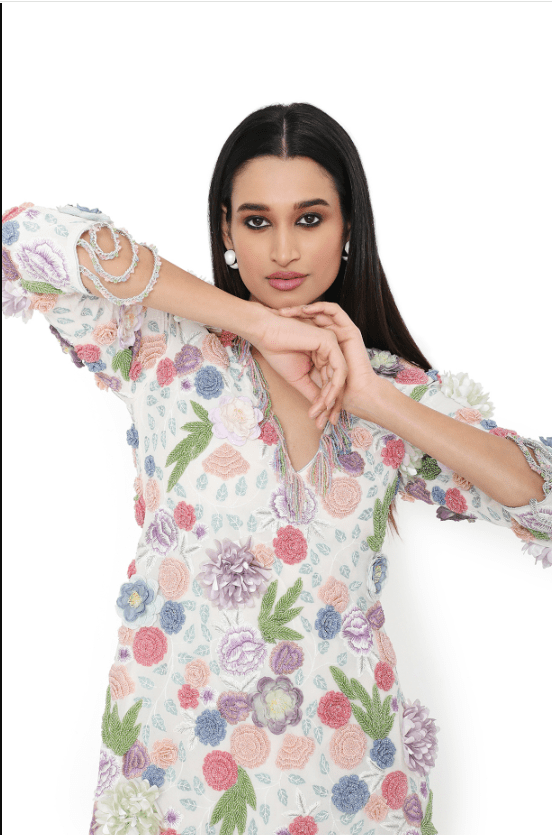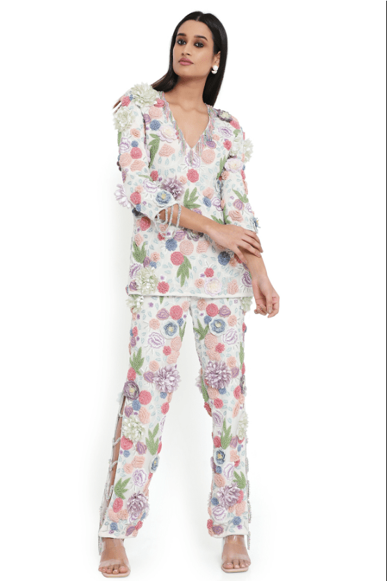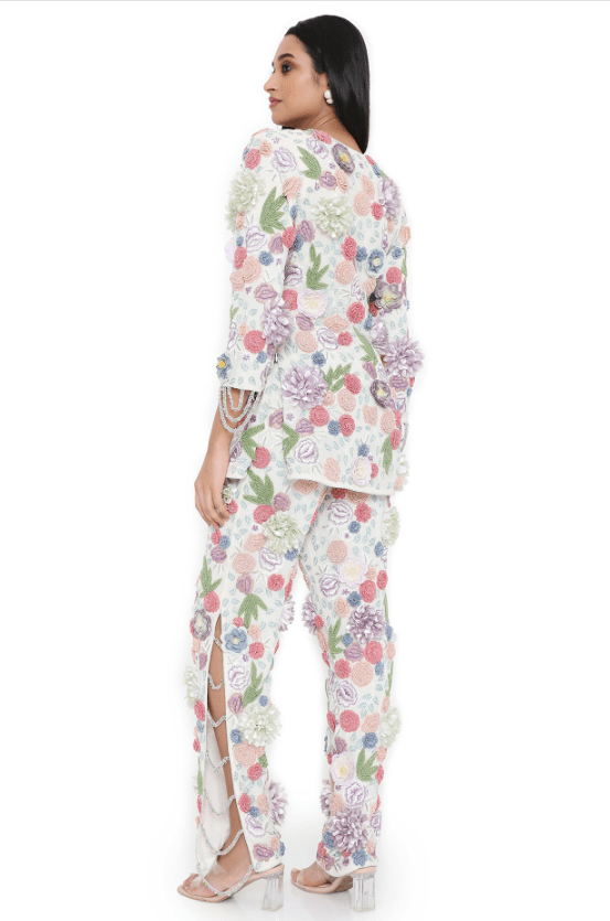 Off-White Short Kurta Set that captivates with its elegance. The eye-catching kurta is crafted in georgette with embroidery. It is paired with pants having side metal chain hangings. Style the designer kurta set with statement jewellery and heels for festive occasions, showcasing style and sophistication.