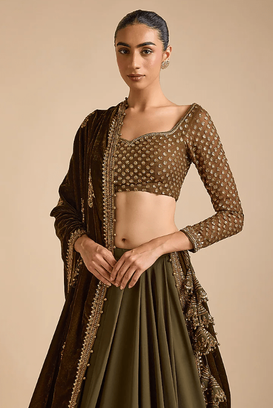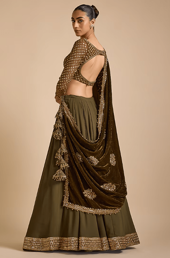 Featuring an olive green lehenga in georgette base with embellishments. It is paired with a blouse having a sweetheart neckline and a velvet dupatta. Style it with statement accessories and sandals for a sangeet or engagement ceremony.