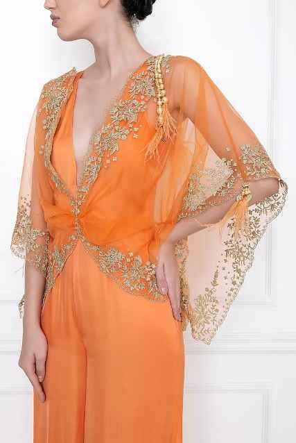 Featuring an orange draped kaftan in net base with machine embroidery, including pearl and feather tassels. It is paired with a matching cotton satin jumpsuit.