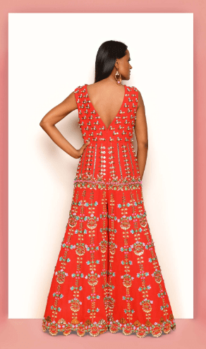 Paris Hilton in a tomato red with linear motif placement of 3-D metallic embellishments strung along with bead and pearl details.