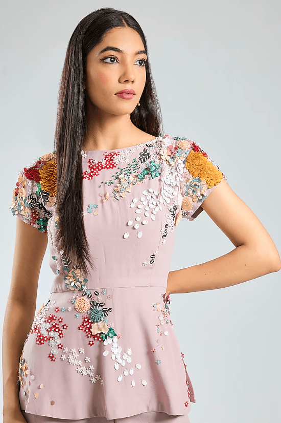 Featuring a peach peplum top in crepe base with hand embroidery. It is paired with tailored pants. Accentuate it with statement jewellery and heels for a grand celebration or evening soiree.