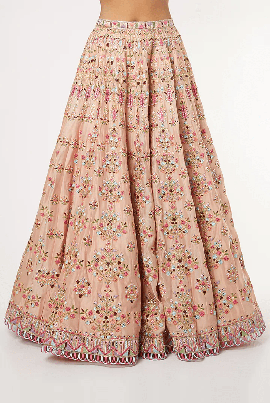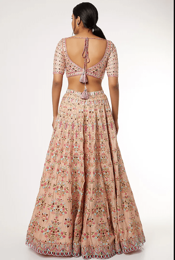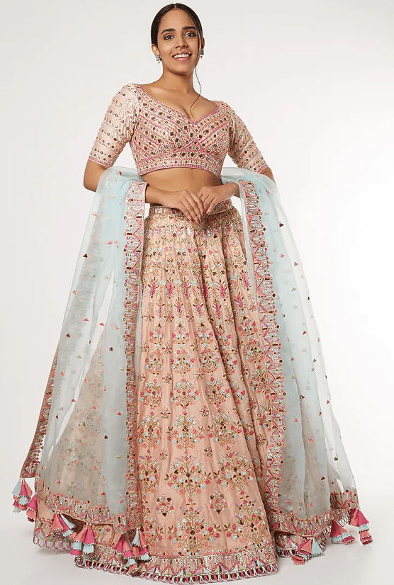 Featuring a peach lehenga in chanderi base with resham, foil, dori, gota, and mirror embroidery. It is paired with a matching blouse and a sky blue organza dupatta having tassels.