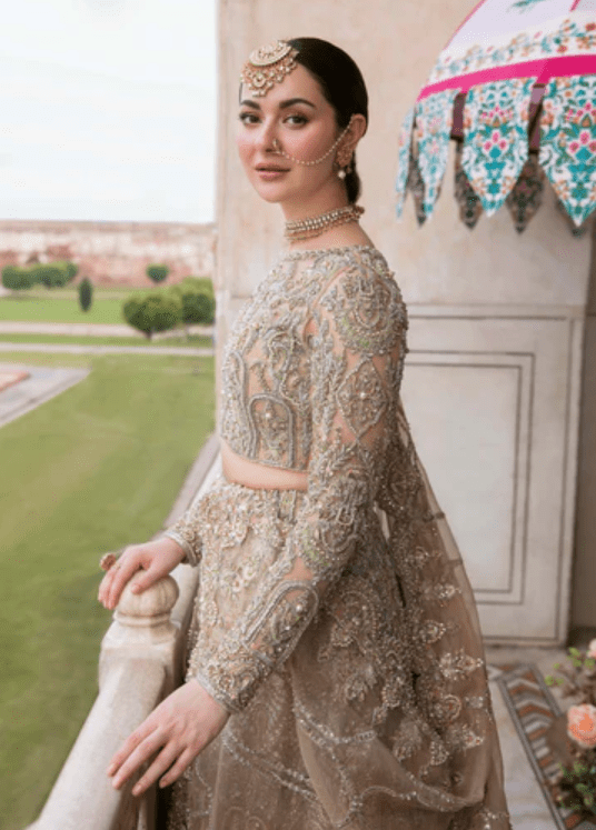 This elegant Pakistani Bridal Dress in Peach Lehenga Choli style achieves the final ravishing look when paired with a delicate dupatta. Embellished borders, sitara, silver work, and beaming ornaments make this organza dupatta a perfect choice for this Bridal Lehenga Choli Dress.