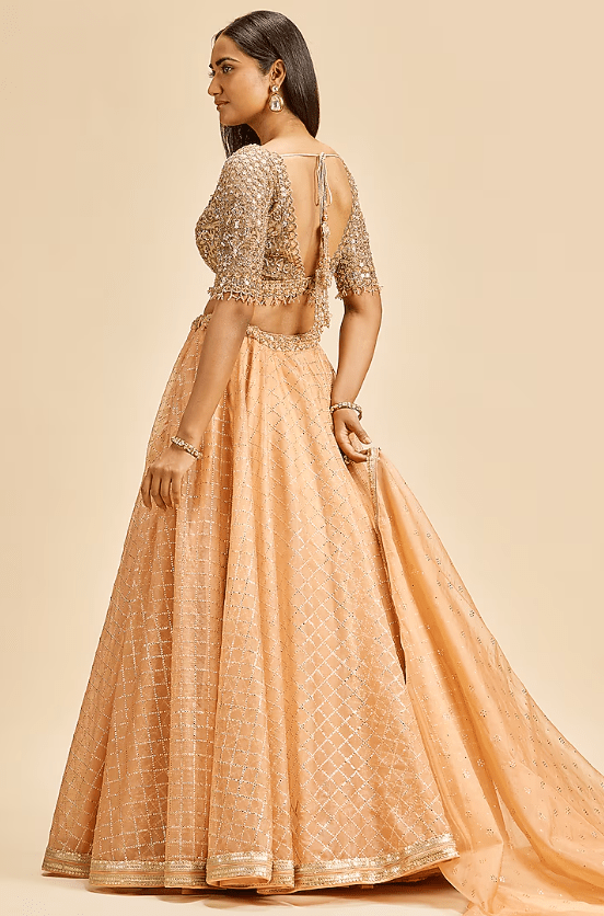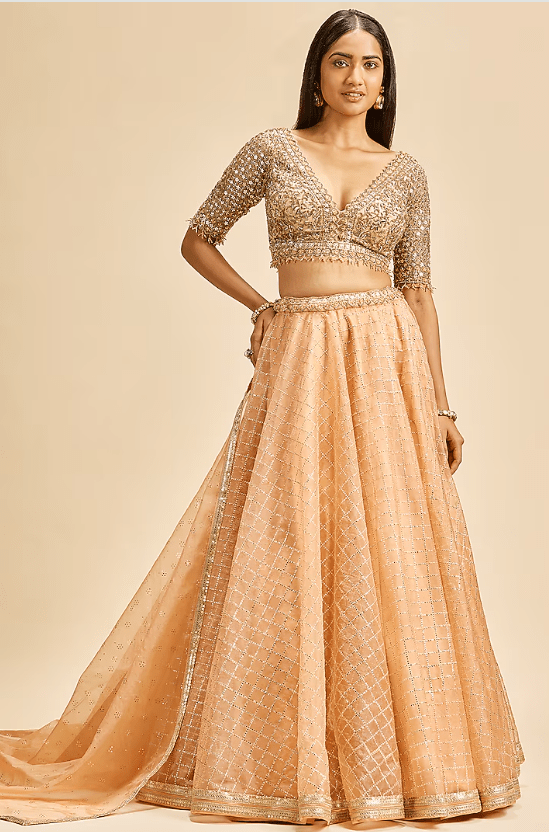 peach lehenga in mukaish organza base with print. It is paired with a contrasting gold net blouse having gold zari, crystals, and beads embroidery, including an organza dupatta. Accentuate with statement jewellery and heels for a wedding or an engagement ceremony.