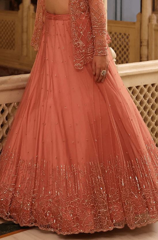 Featuring a peach lehenga in net and satin base with hand embroidery, including a cancan. It is paired with a net crop top and a net jacket. Accentuate it with statement earrings and heels for a festive occasions or wedding ceremonies.