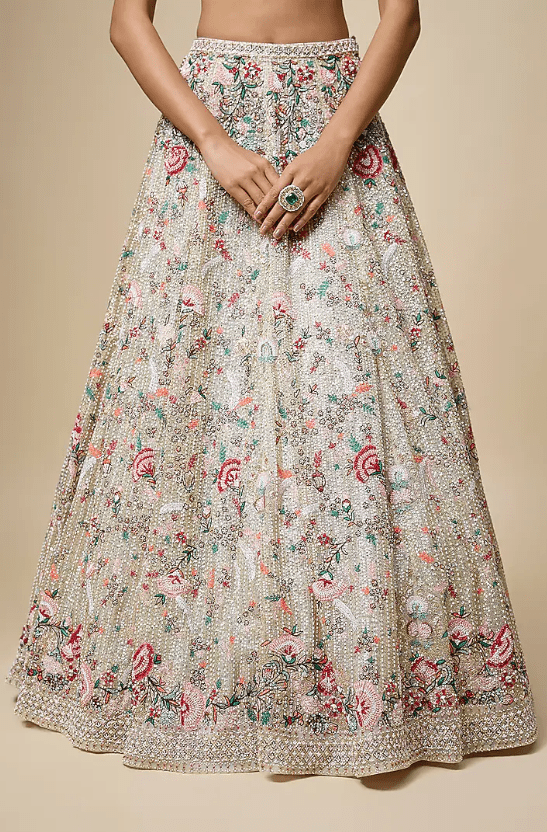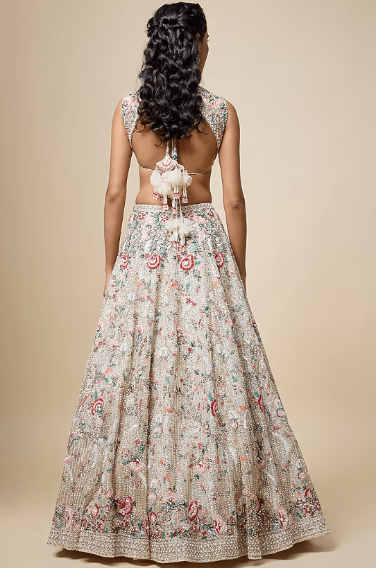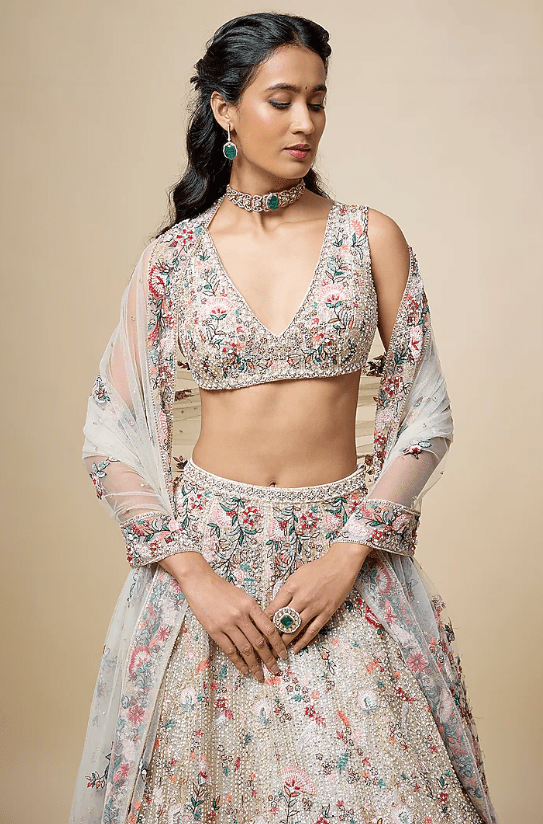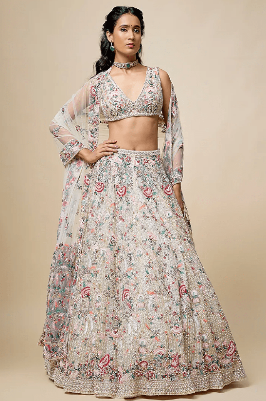 Featuring a peach lehenga in organza base with embroidery. It is paired with an embroidered blouse and a dupatta. Accentuate it with zirconia or swarovski jewellery, block heels and a clutch for a destination wedding or engagement ceremony.