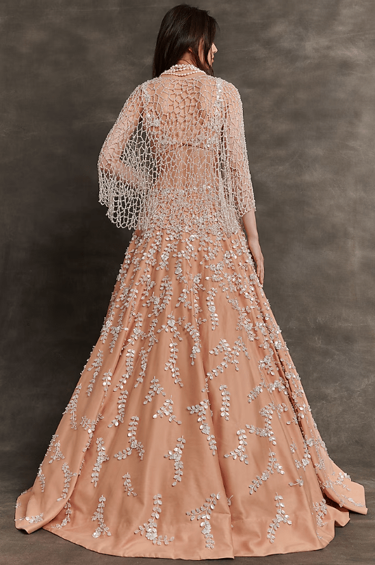 Featuring a peach pink lehenga in net base with leaf embroidery. It is paired with a blouse having a v-neckline and an embroidered cape. Accentuate with statement earrings, metallic heels, and a sleek updo for an elegant evening wedding or reception.
