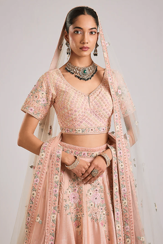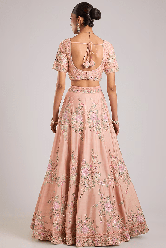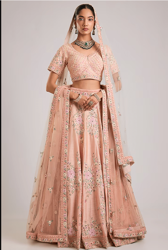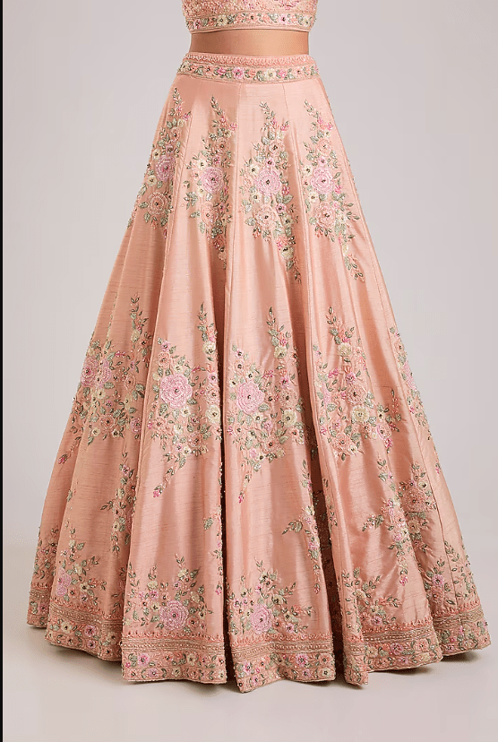Featuring a peach lehenga in raw silk base with embroidery. It is paired with an embroidered blouse and a pair of embroidered dupattas. Accentuate the designer lehenga with kundan polki or pearl jewellery, a sleek bun, embellished heels and a potli bag for a bridal look. Perfect wear for your wedding or engagement ceremony.