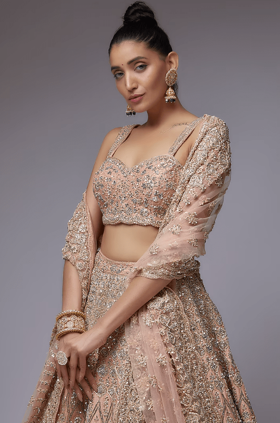 Featuring a peach lehenga in raw silk base with hand and machine embroidery and a can-can. It is paired with a matching blouse and a dupatta.