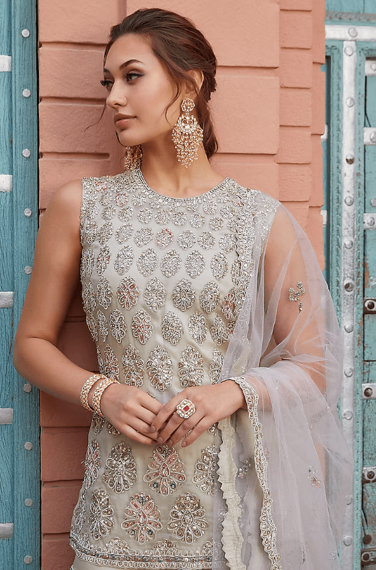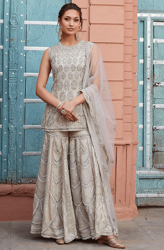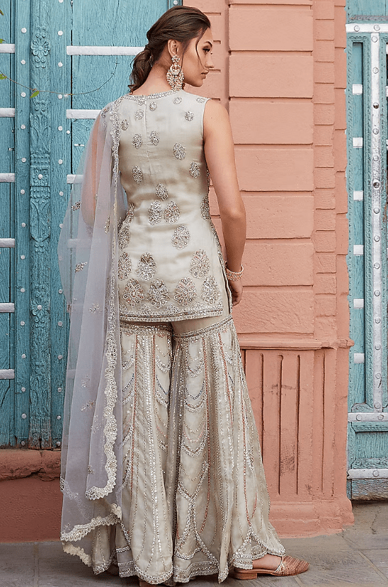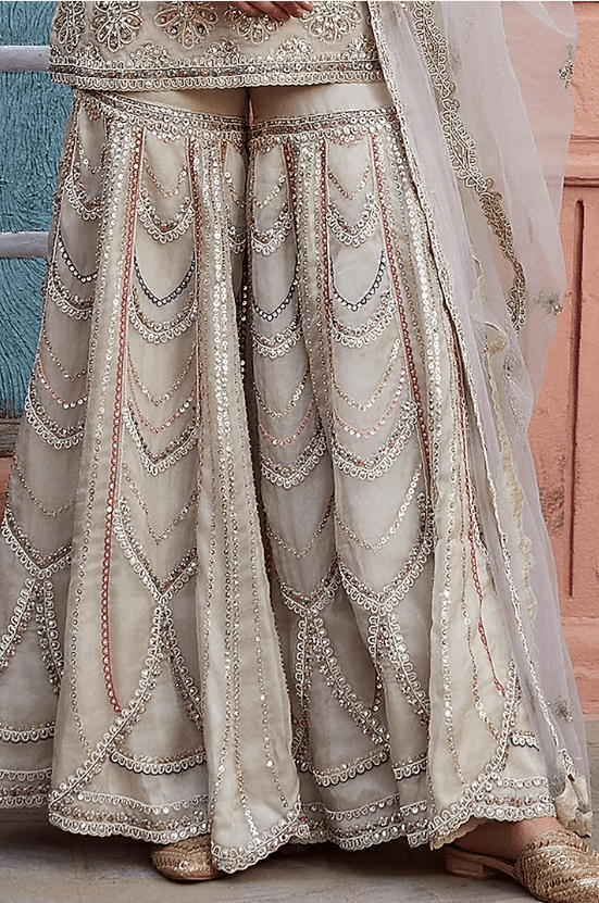 Featuring a pearl kurta in organza base with zardosi and thread hand embroidery. It is paired with matching embroidered sharara pants and a dupatta.