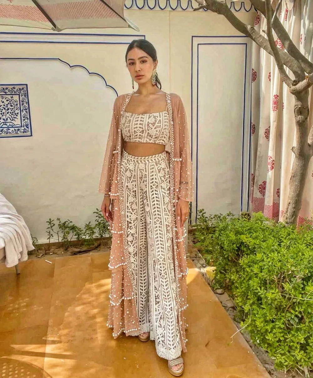 Pearl Embroidered Tiered Frill Jacket Paired With a Lace Bustier & Pallazo