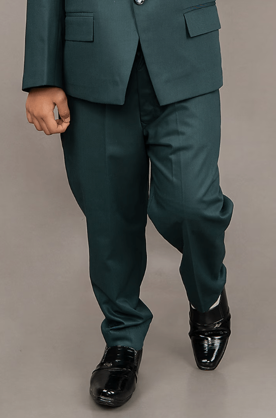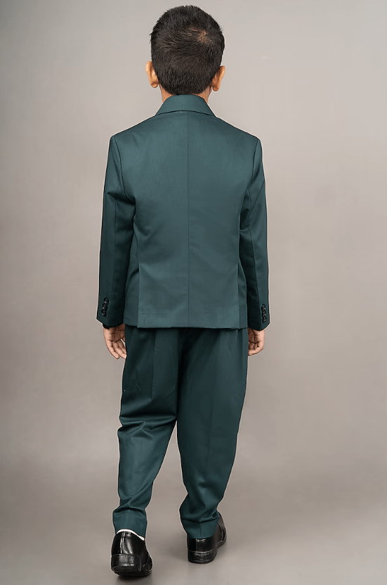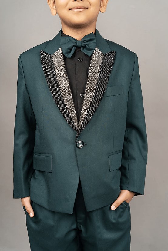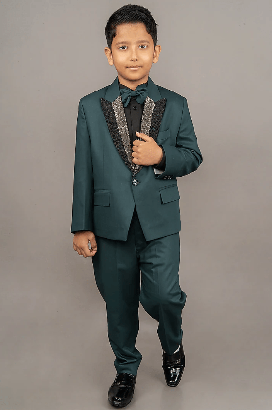 Featuring a pine green suit for boys in cotton blend and viscose blend base with laple embroidery. It is paired with a white shirt, a bow-tie and pants. Style it with a watch and a pair of shoes for a wedding or reception ceremony.