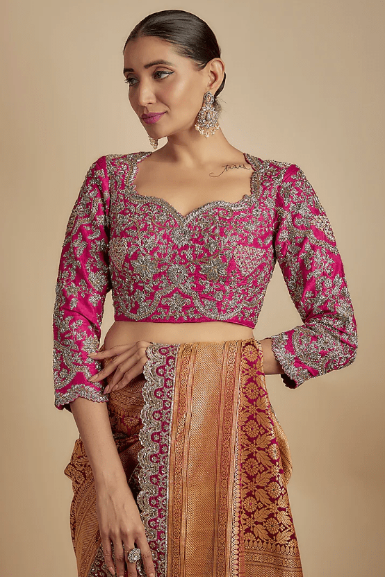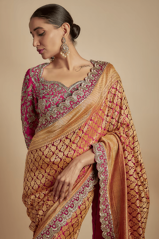 Featuring a pink saree in banarasi silk base. It is paired with a zari embroidered blouse. Accentuate it with statement jewellery and heels for a wedding or engagement ceremony.
