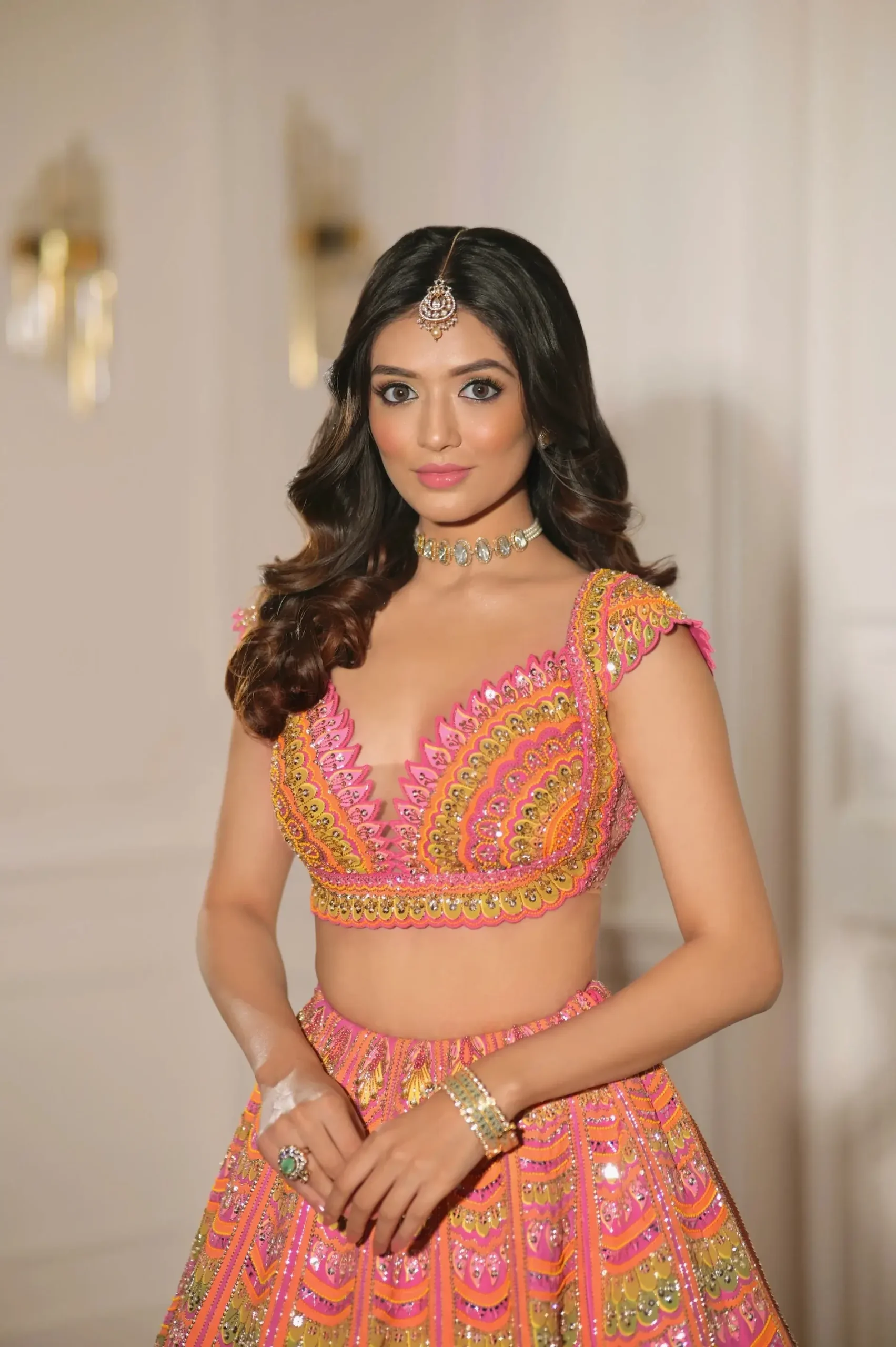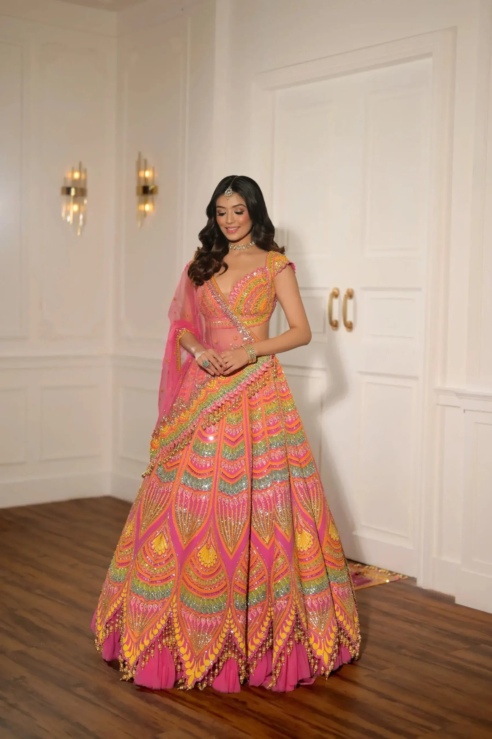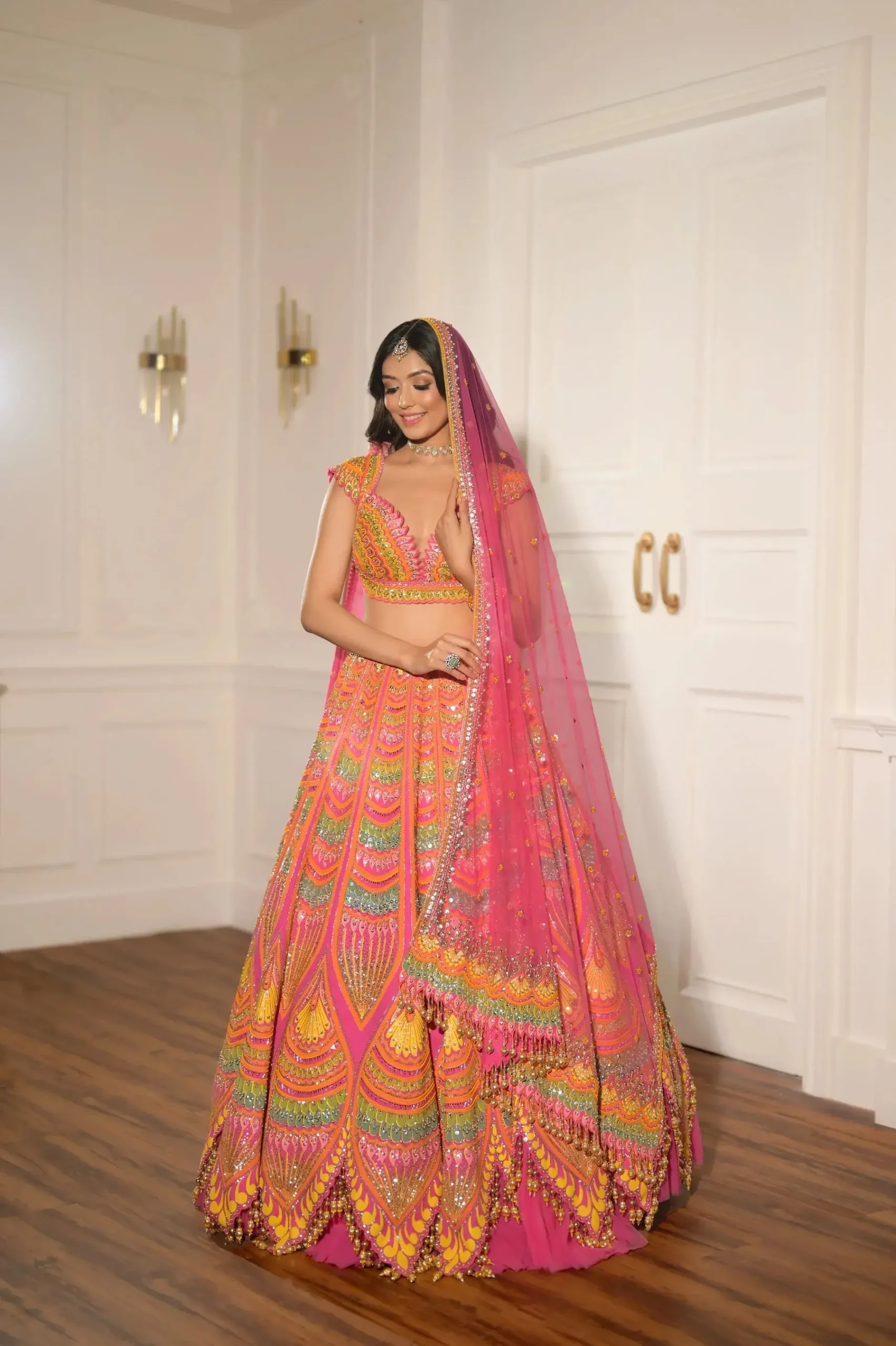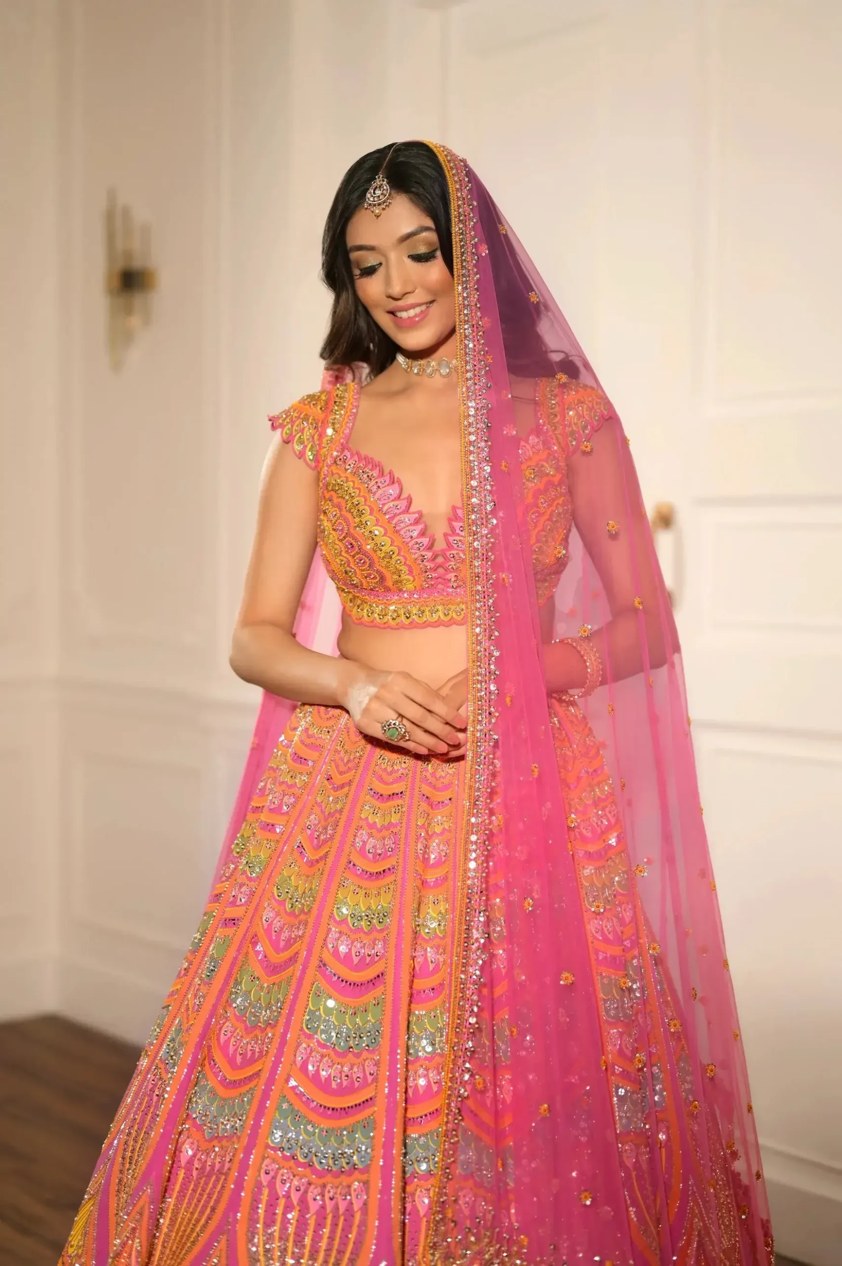 The Pink Lotus Lehenga, where soft pinks unfurl like petals opening to the sun, whiles hues of green and gold glisten like leaves catching the light. Mirror-work sparkles between the folds, evoking the quiet shimmer of a lotus blooming by the lake.