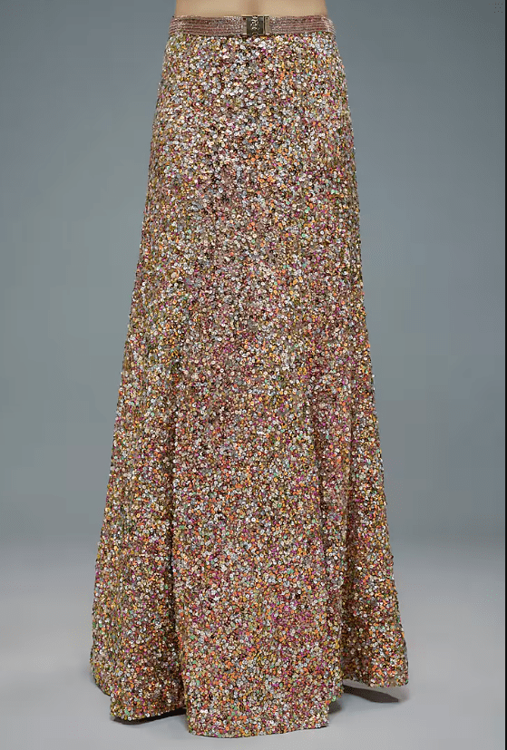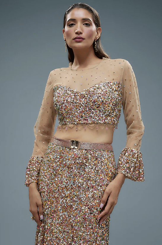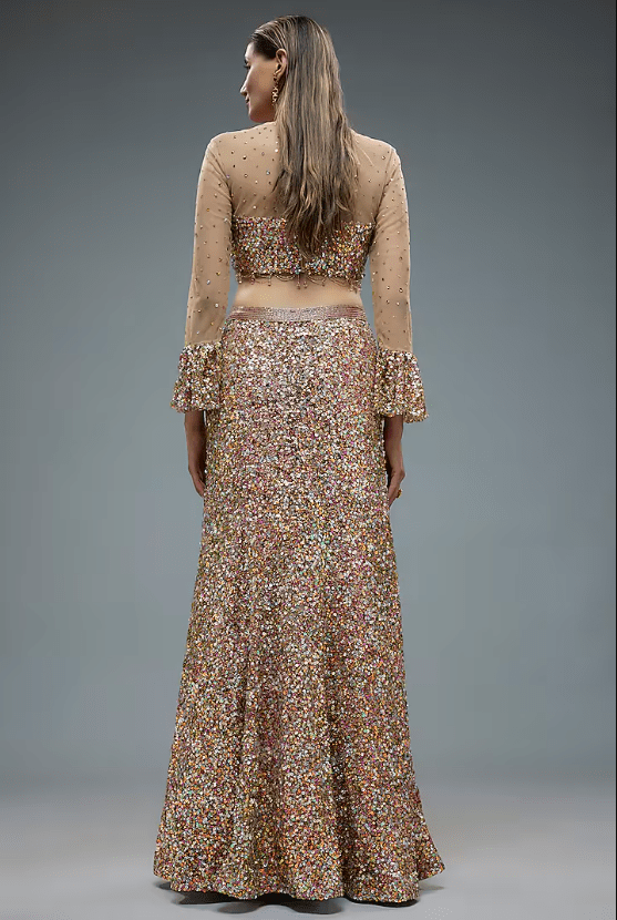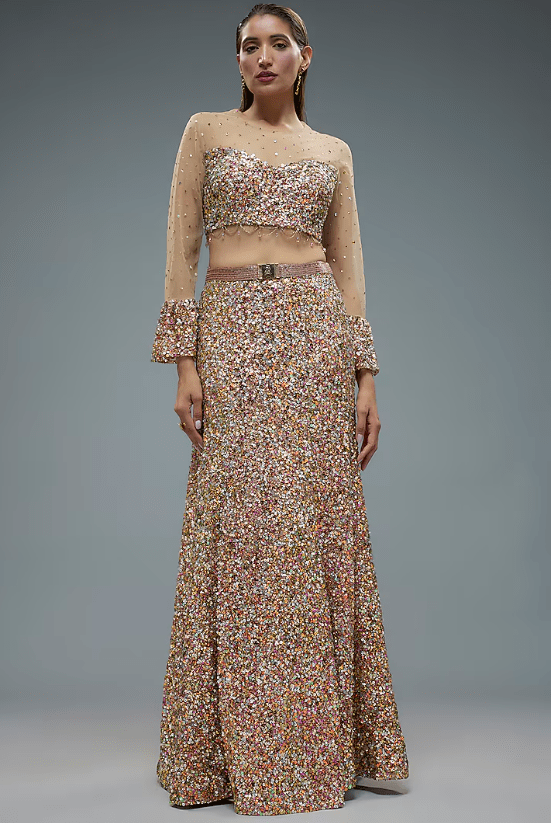 Featuring a pink lehenga in net base with sequins embroidery and signatured R-buckle detail. It is paired with an embroidered blouse having flared sleeves. Accentuate with statement earrings, metallic heels, and a sleek updo for an elegant evening wedding or reception.