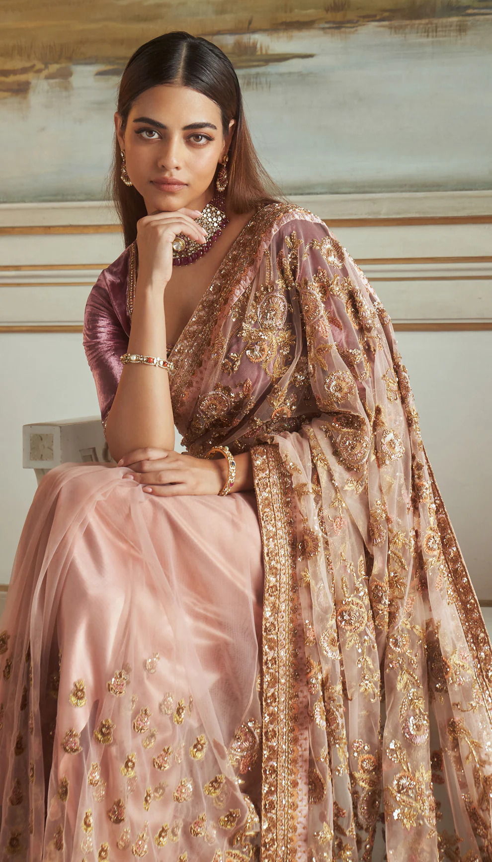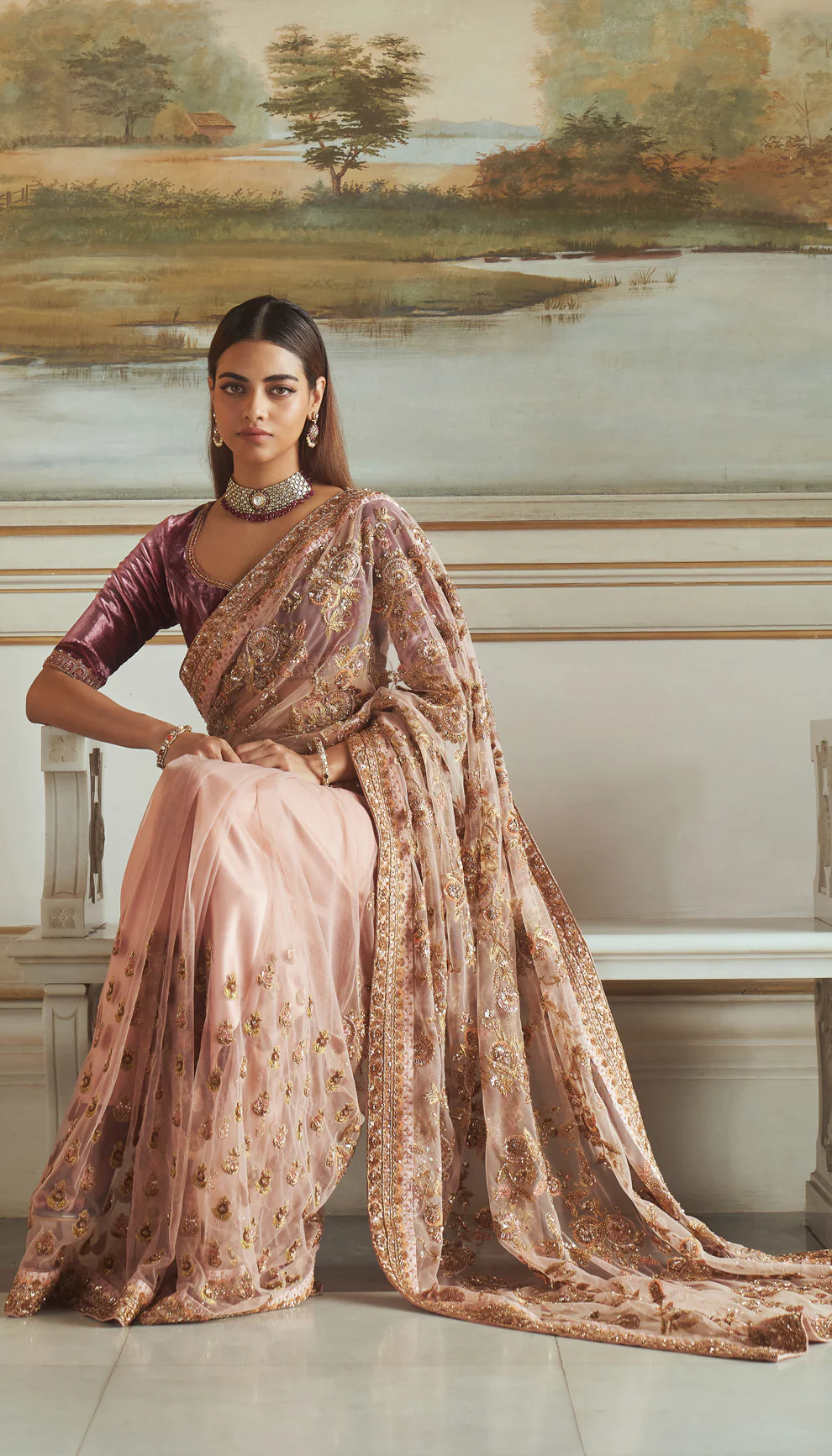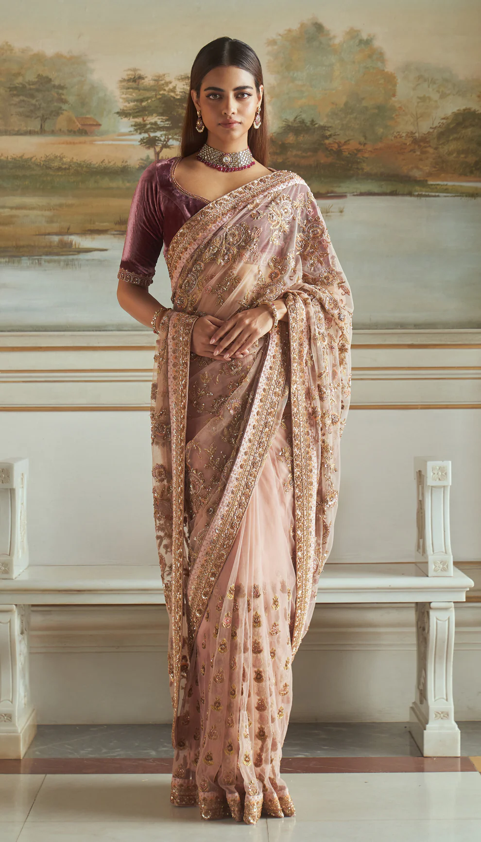 A vintage rose tulle saree, hand crafted with elaborate antique zardozi embroidery all over. This is teamed with a sepia purple velvet blouse with rich gold aari and zardozi embroidery
