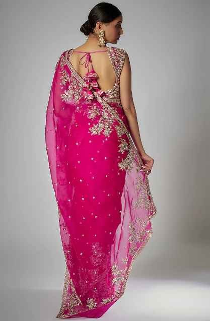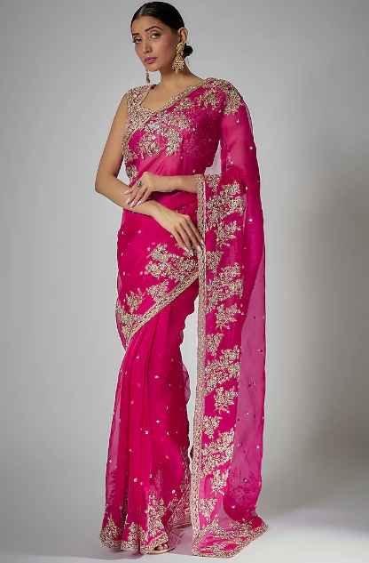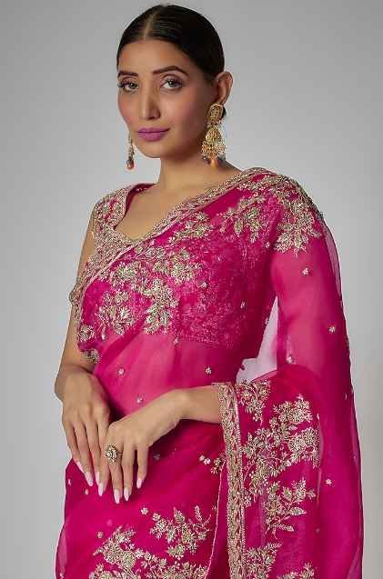 Featuring a pink saree in organza base with zardosi embroidery. It comes with a raw silk unstitched blouse piece. A perfect addition to your bridal trousseau.
