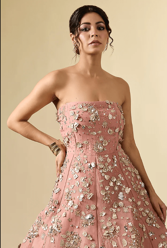 Featuring a pink ball gown in organza base with hand embroidery. It comes with a cancan. Accentuate it with statement jewellery and heels for cocktail ceremony.