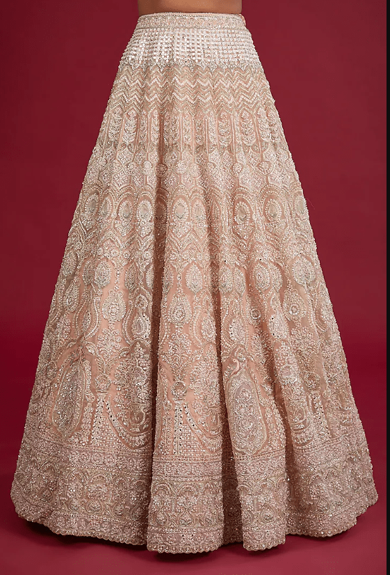Featuring a pink lehenga in organza base with patch work, zardosi, hand and machine embroidery, including a cancan. It is paired with an embellished bustier having maal work and a dupatta. Style this lehenga with necklace set for a bridal look.
