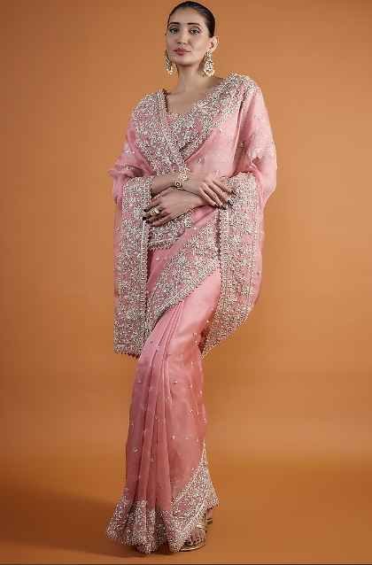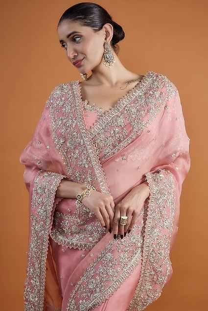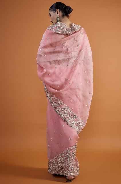 Featuring a pink saree in organza base with zardosi embroidery. It is paired with an unstitched blouse piece. Accentuate with statement jewellery and heels for a bridal look.