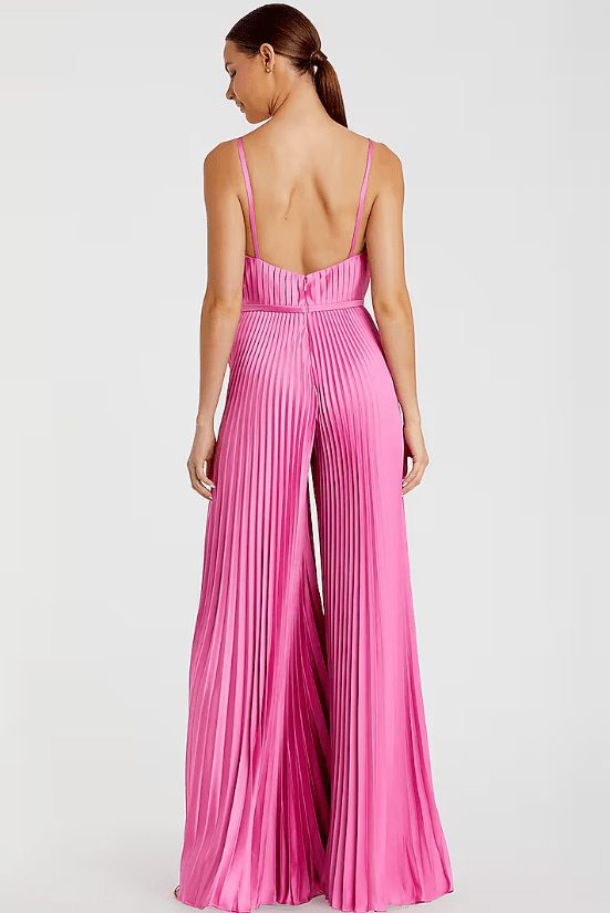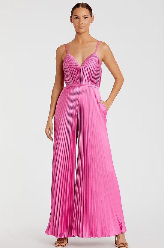Featuring a pink wide-leg pleated jumpsuit in polyester base with pockets detail. Enhance your jumpsuit with statement earrings and chic heels for an effortlessly elegant look.