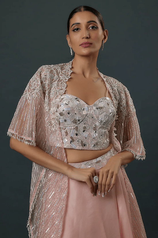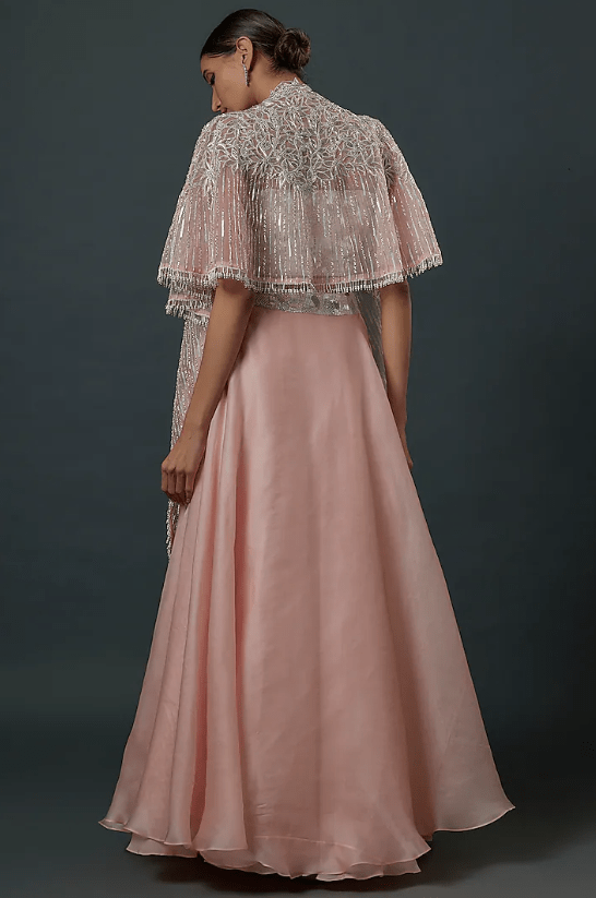 Featuring a pink cape in pure organza and satin organza base with floral embroidery and cutwork. It is paired with an embroidered corset bustier and a satin georgette embroidered flared skirt. Accentuate with statement jewellery and heels for a sangeet ceremony.