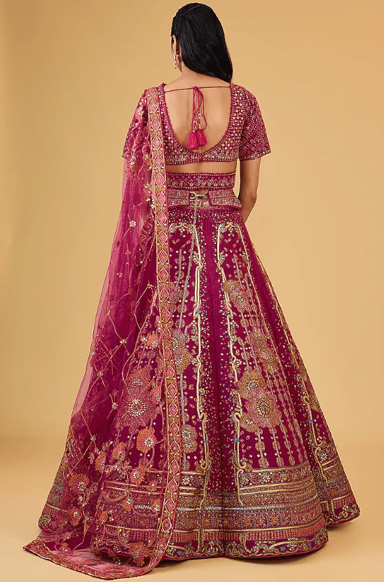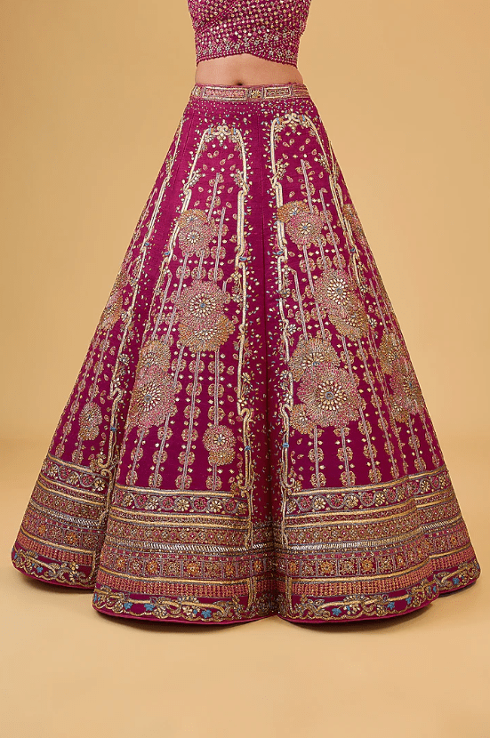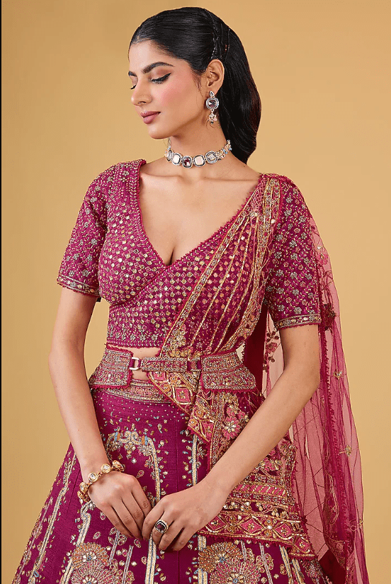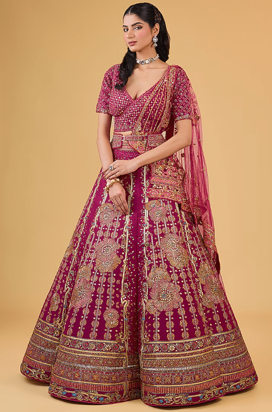 Featuring a pink lehenga in raw silk base with hand and machine embroidery. It is paired with a blouse, belt and a dupatta. Accentuate it with statement jewellery and heels for a wedding, sangeet or engagement ceremony.