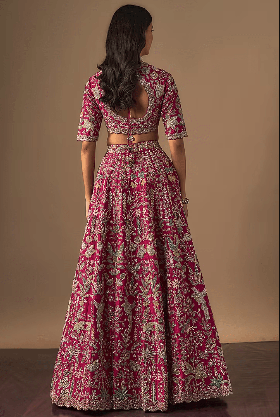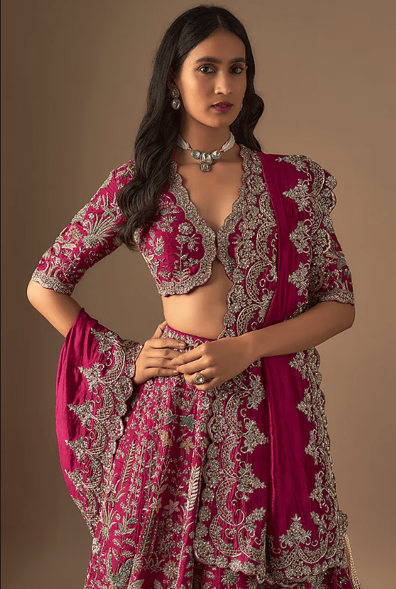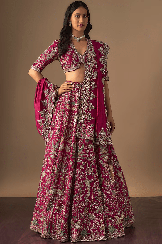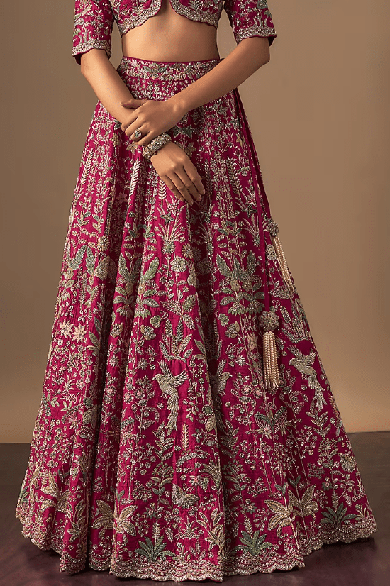 Featuring a pink lehenga in raw silk base with zardosi embroidery. It is paired with a blouse and a dupatta. Accentuate it with statement jewellery and heels for a wedding or engagement ceremony.