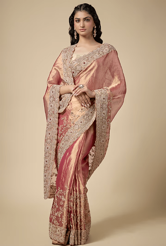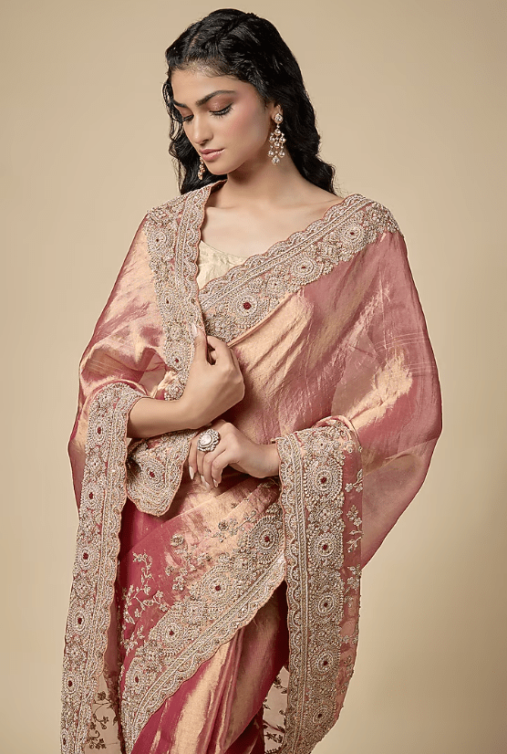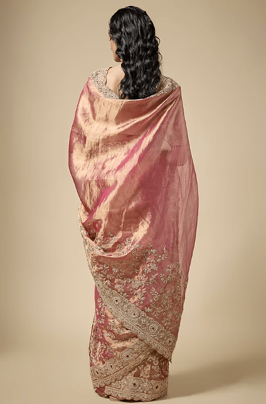 Featuring a pink saree in tissue base with zardosi work. It is paired with an unstitched blouse. Accentuate it with statement jewellery and heels for a festive occasion, wedding, sangeet or engagement ceremony.