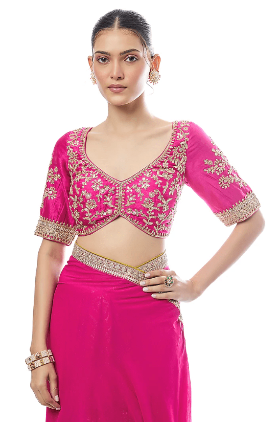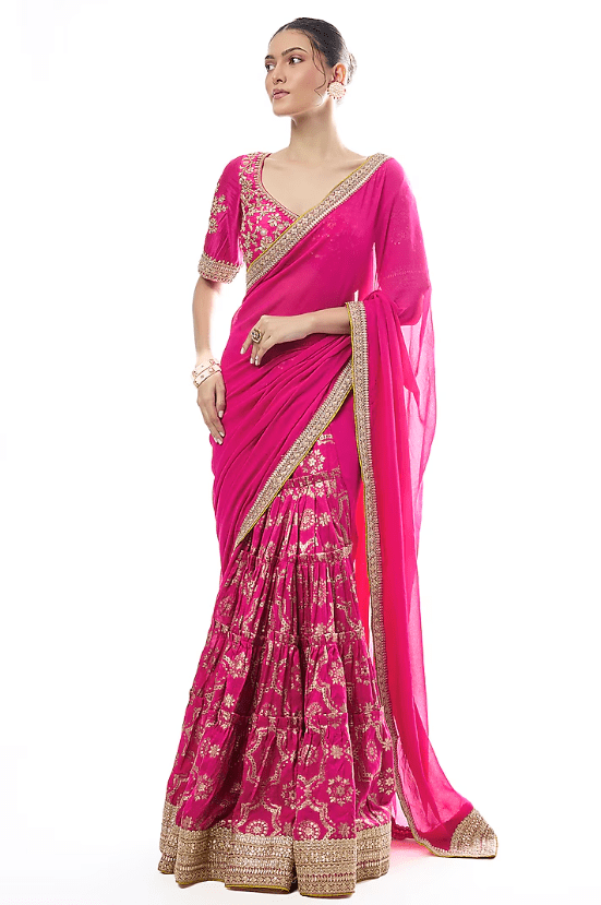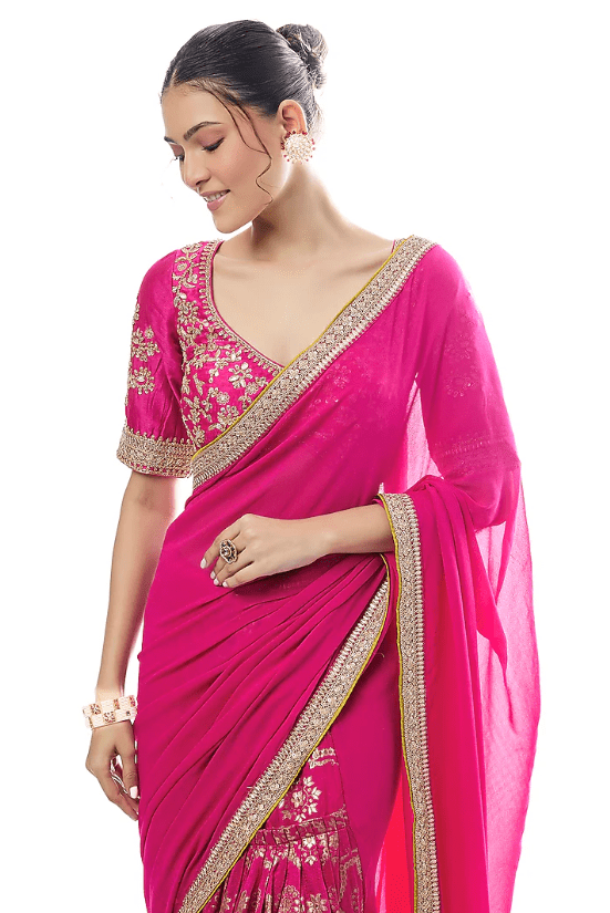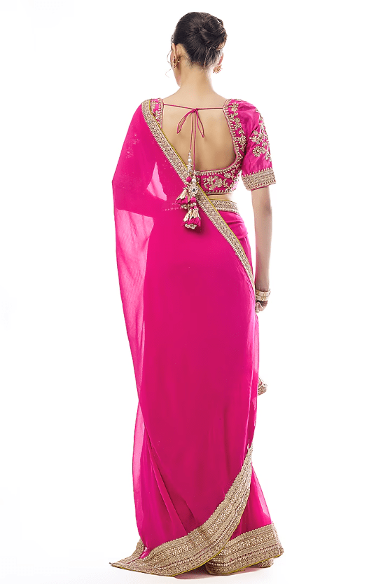 Featuring a pink saree in tussar and georgette base with embroidery. It is paired with a tussar embellished blouse. Accentuate it with statement chandbali earrings and an embellished juttis for a refined ensemble, ideal for sangeet ceremonies or festive occasions.