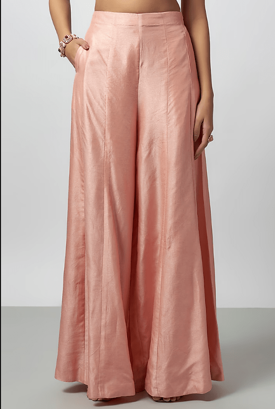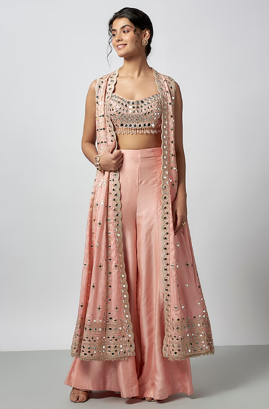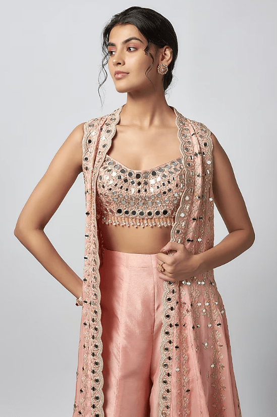 Featuring a pink jacket in tussar base with mirror work. It is paired with a tussar embroidered blouse and flowy palazzo pants. Accentuate it with statement jewellery and heels for a wedding, sangeet or engagement ceremony.