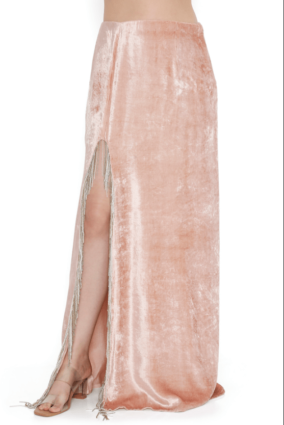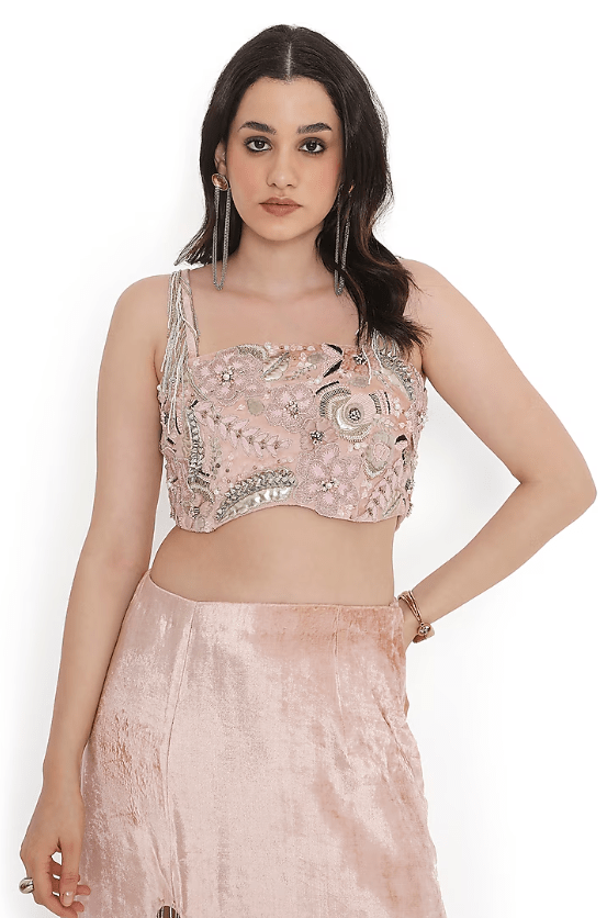 Pink Skirt Set that captivates with its elegance. The eye-catching skirt is crafted in velvet with a slit. It is paired with a georgette embroidered blouse. Accessorize the designer set with statement earrings and heels for a sangeet or engagement ceremony.