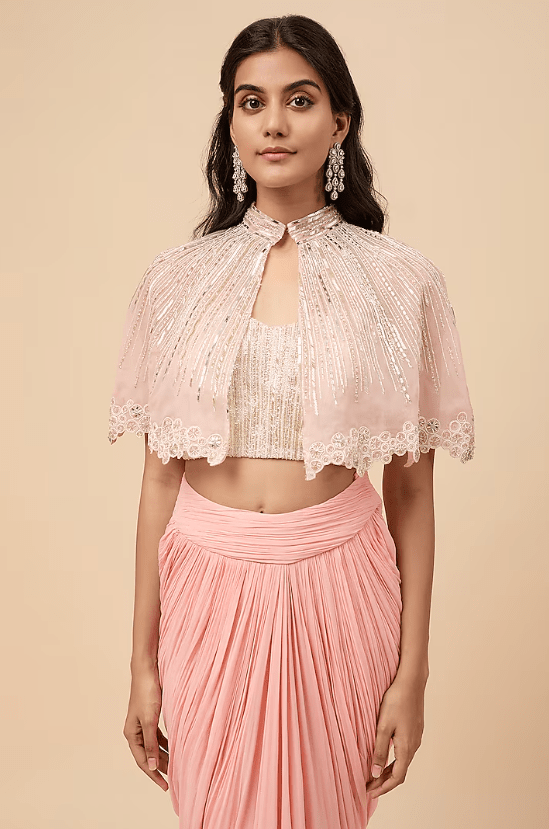 Featuring a pink cape in viscose and organza base with embroidery. It is paired with an embroidered blouse and a viscose-draped skirt. Accentuate it with statement earrings and heels for a complete look.