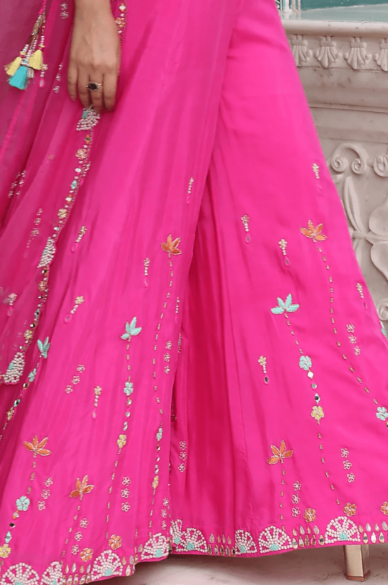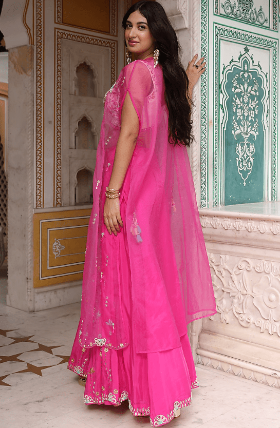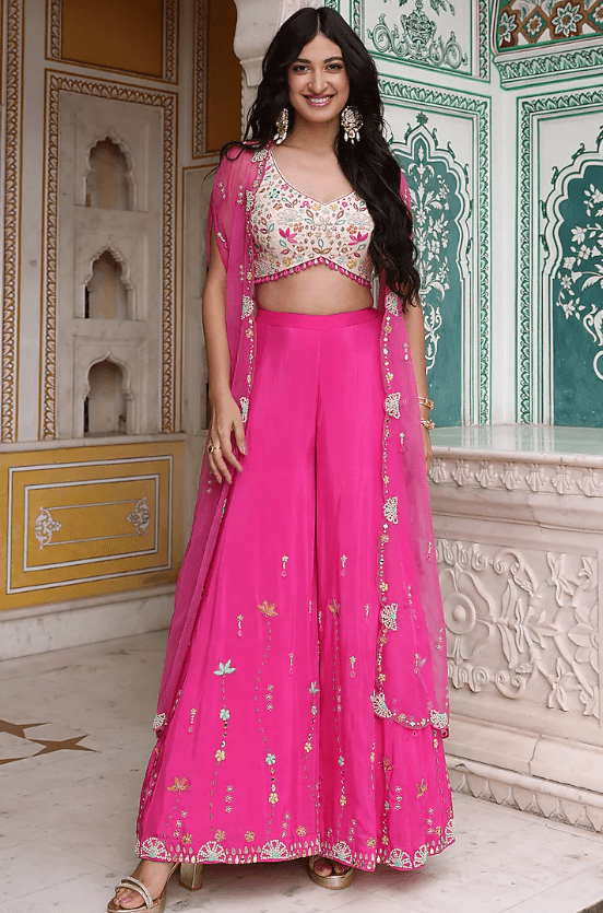 Featuring a pink cape in organza base with hand embroidery. It is paired with a dola silk blouse and viscose habutai sharara pants having cancan. Accentuate it with statement earrings and heels for a festive occasion, engagement or sangeet ceremony.