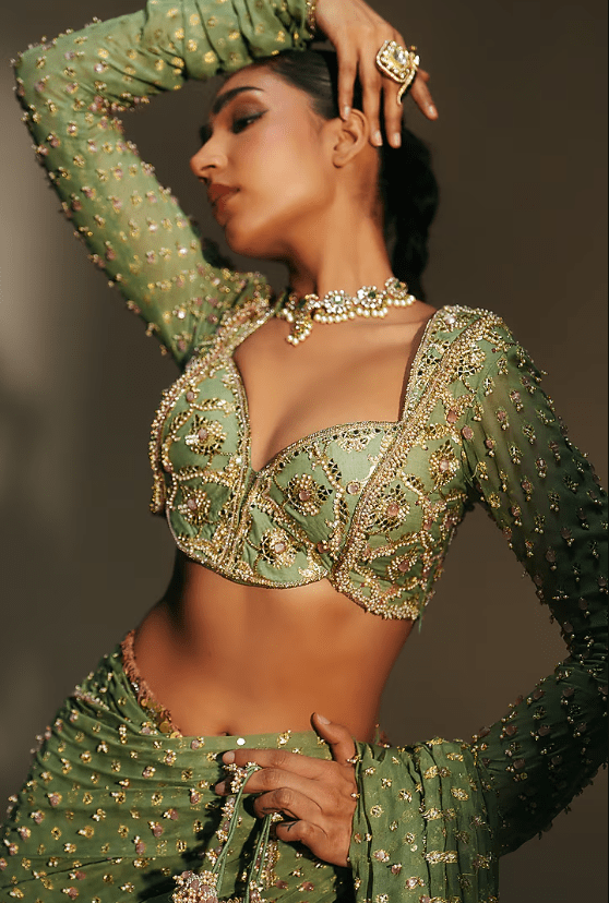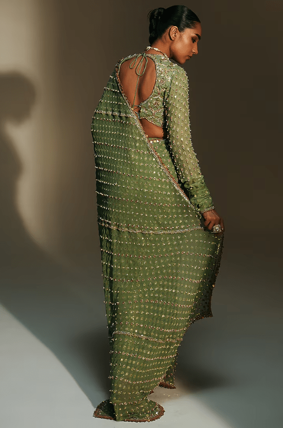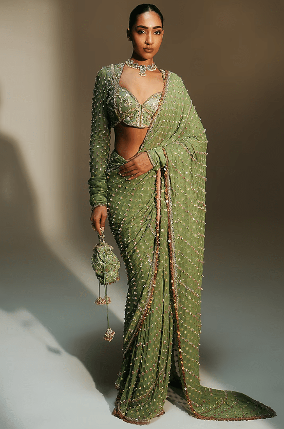 platinum pre-draped saree crafted in banarasi georgette base with hand embroidery. It is paired with an embroidered blouse. Accentuate the look with chunky earring, an embellished potli bag and block heels for a perfect a wedding, sangeet or engagement ceremonies.