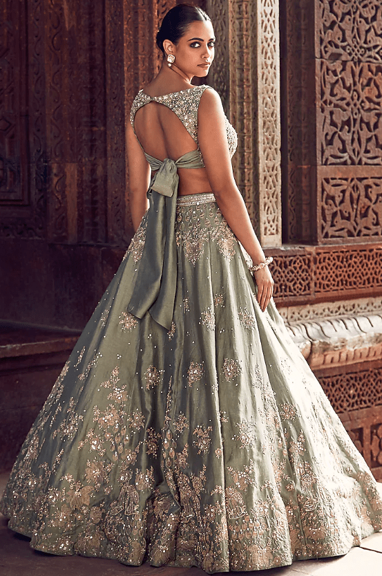 a pista green lehenga in chanderi base with floral and paisley applique embroidery. It is paired with an embroidered blouse, a dupatta and a potli bag. Style it with statement jewellery and heels for a wedding, mehendi for engagement ceremony.