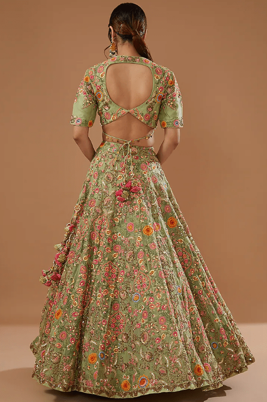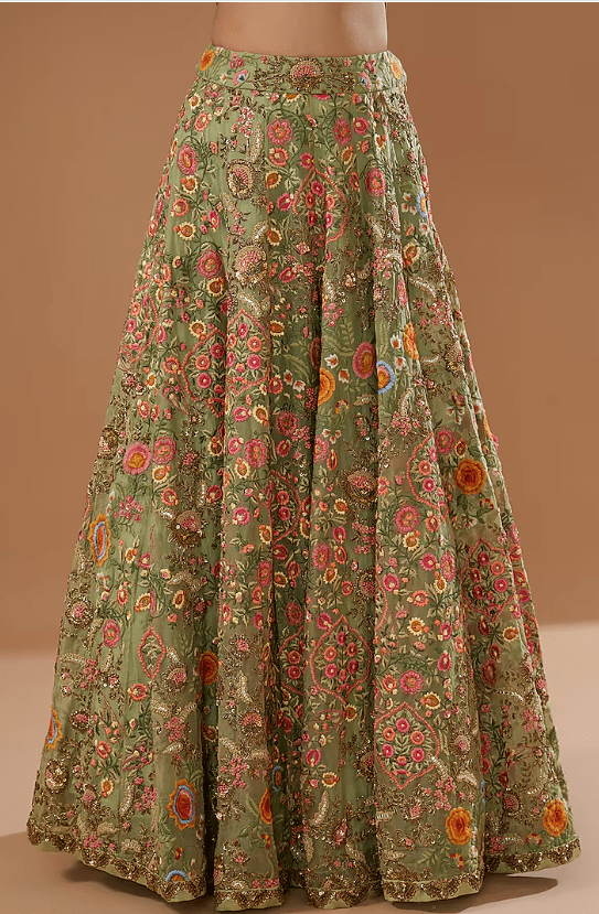 Featuring a pista green lehenga in organza base. It is paired with a blouse and a dupatta. Perfect wear for bridal look.