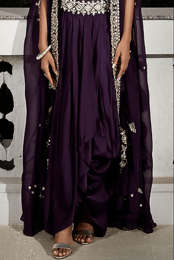 Featuring a plum cape in georgette organza base with pittan, kasab, aari and zardosi embroidery. It is paired with a matching blouse and a draped skirt.