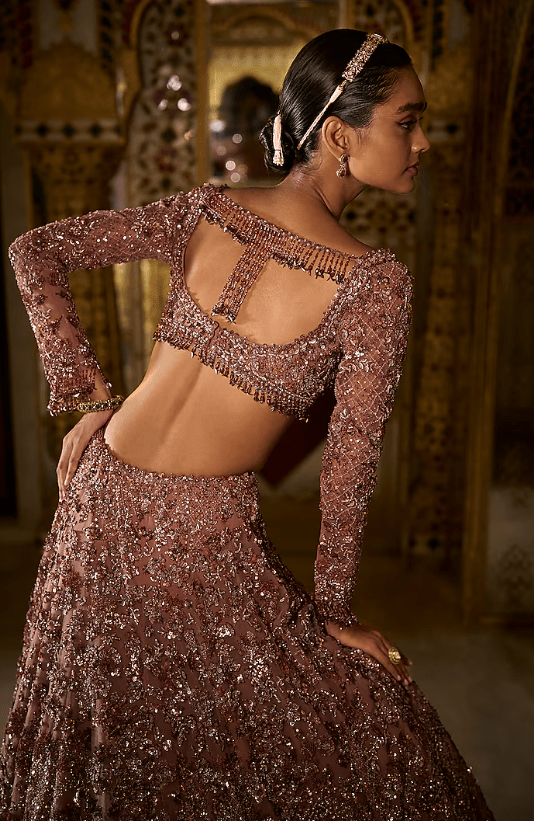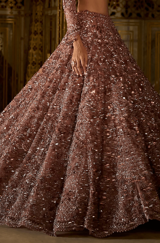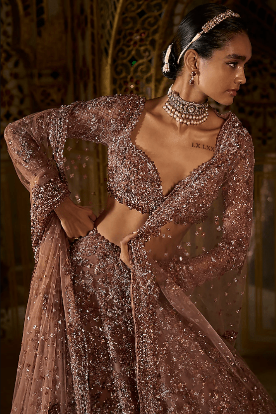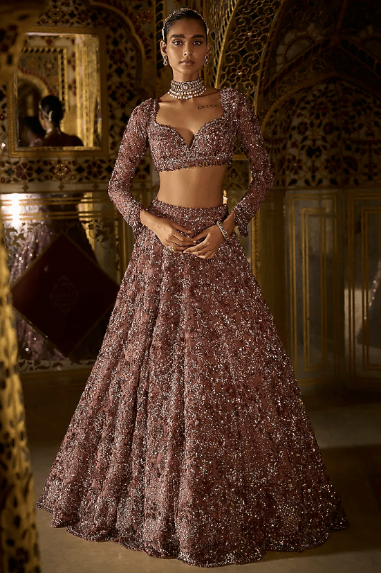 plum lehenga in net base with sequins, beads, and crystal embroidery. It is paired with an embroidered blouse having an exaggerated tassels detailing at the back and a scalloped embroidered dupatta. Accentuate it with statement jewellery and heels for your wedding, sangeet or engagement ceremony.
