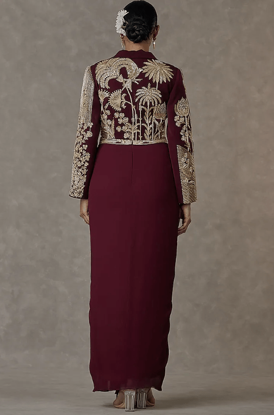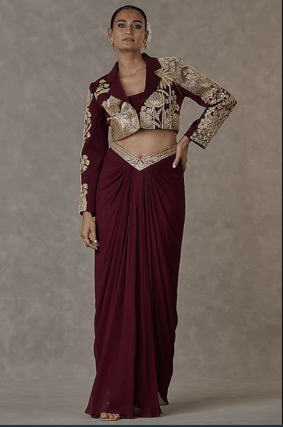 Plum Cropped Blazer Set that captivates with its elegance. The eye-catching blazer is crafted textured knit with moti, dori and sitara embroidery. It is paired with a center back closure tube with detachable straps and a georgette draped skirt having embroidered V-shaped waist belt. Accentuate with statement jewellery and heels for wedding ceremonies or festive occasions.