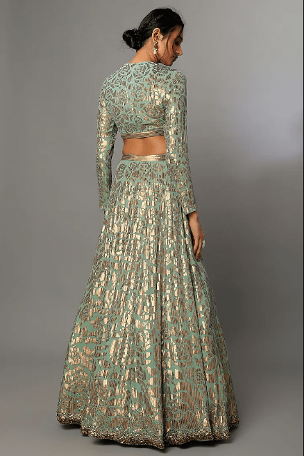 Featuring a PORCELAIN BLUE lehenga in silk chiffon base with sequins work. It is paired with a matching blouse and a dupatta.
